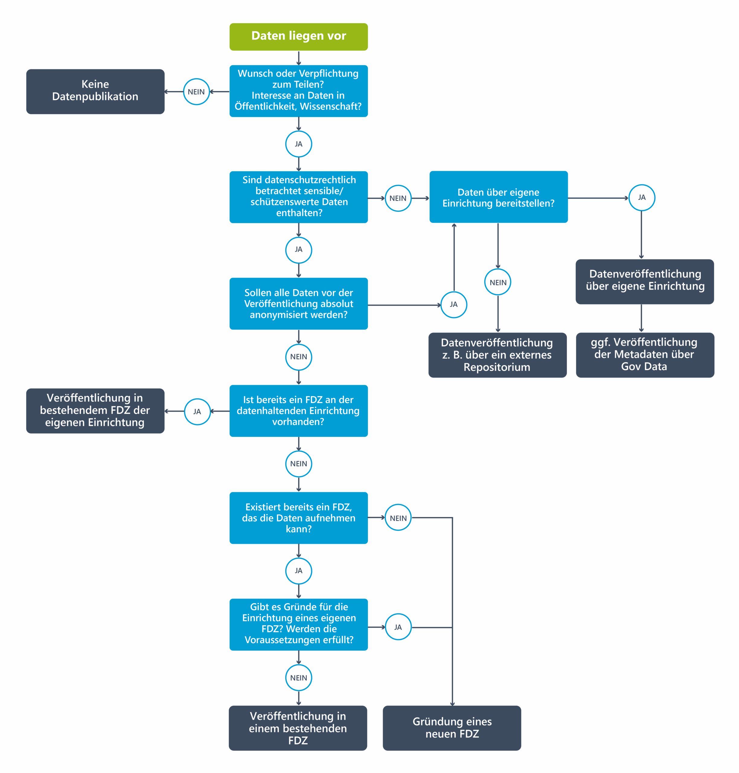 Je nach Art der Daten dürfen diese frei zur Nachnutzung zur Verfügung gestellt werden oder es sind verschiedene Schutzmaßnahmen zu beachten. Wenn eine freie Nachnutzung der Daten möglich ist, kann ein Repositorium für die Veröffentlichung die passende Lösung sein. Wenn Schutzmaßnahmen nötig sind, müssen angemessene technische und organisatorische Vorkehrungen getroffen werden. Sollen sensible, schützenswerte Daten angeboten werden, kann die Bereitstellung über ein Forschungsdatenzentrum (FDZ) erfolgen.